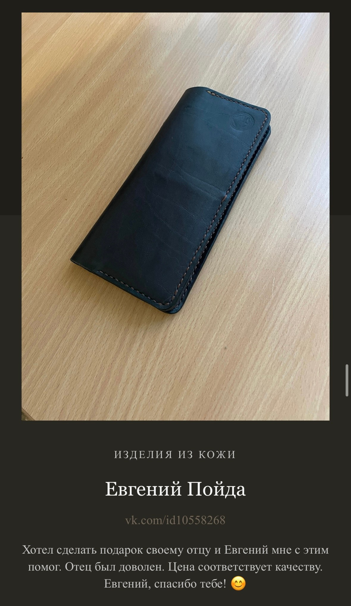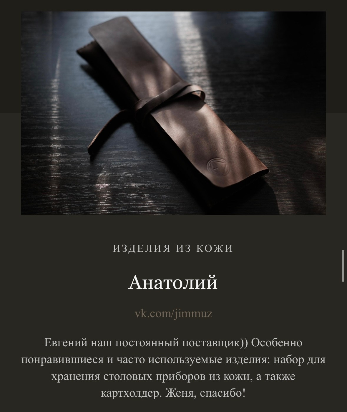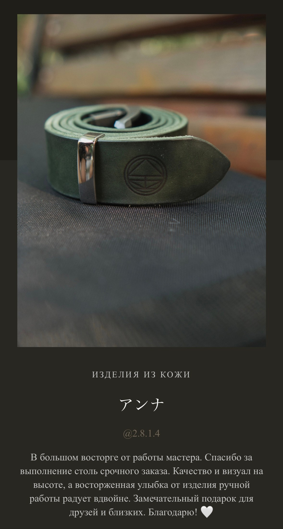 Я, Евгений Ким, создаю каждое изделие вручную. Для меня важно не только то, как вещь выглядит, но и то, какие ощущения она вызывает, как лежит в руке, как стареет и становится только лучше. Мои изделия — для тех, кто ищет не просто аксессуар, а спутника, который подчеркнёт индивидуальность и останется с вами на годы.