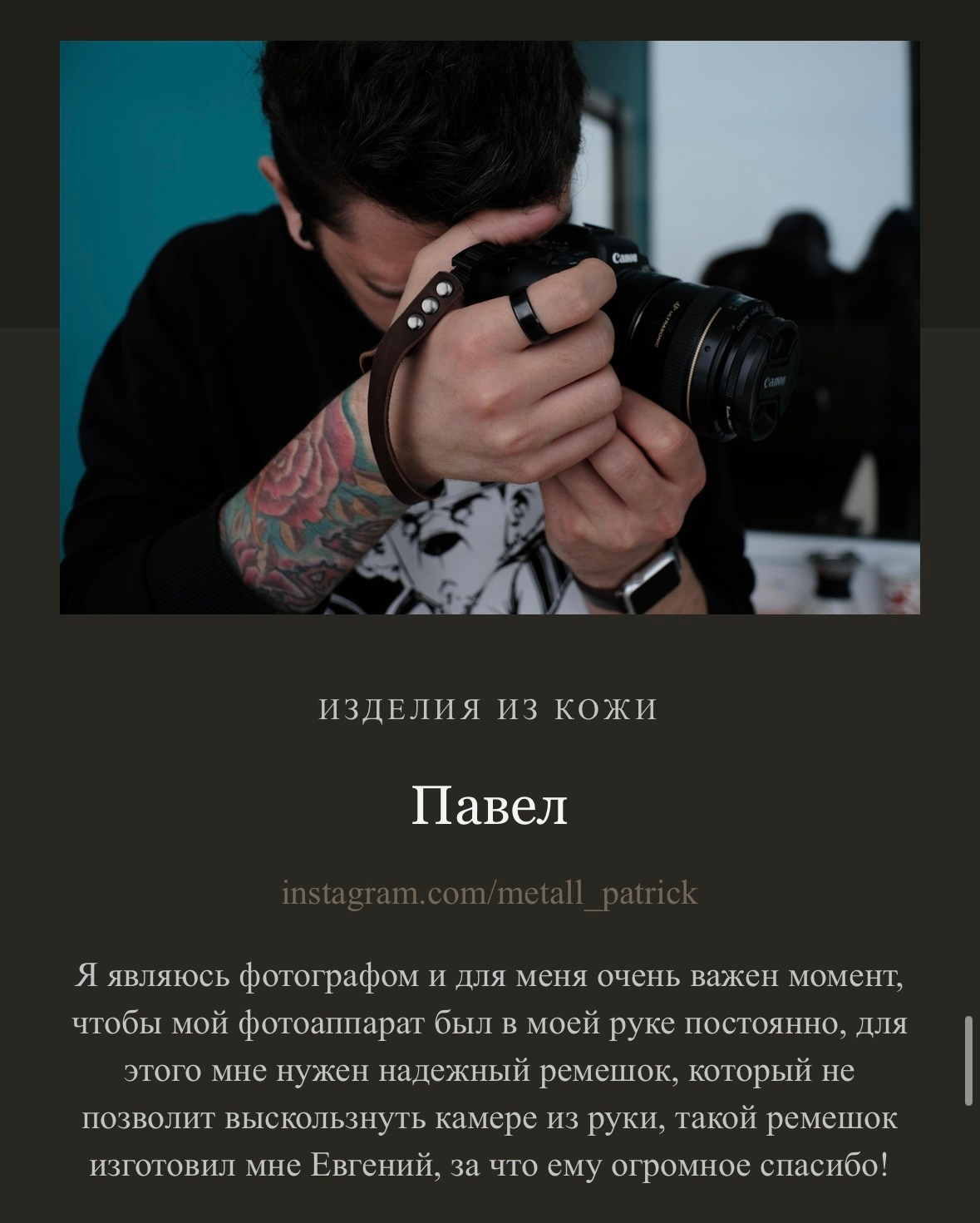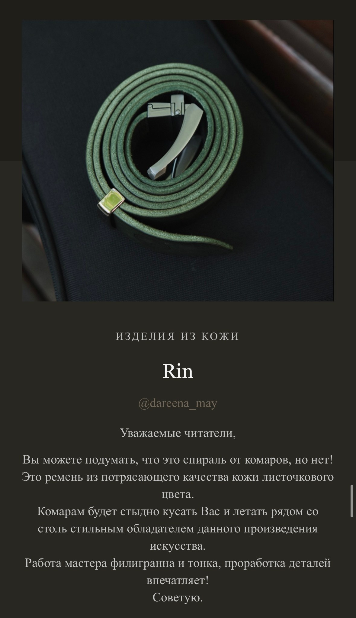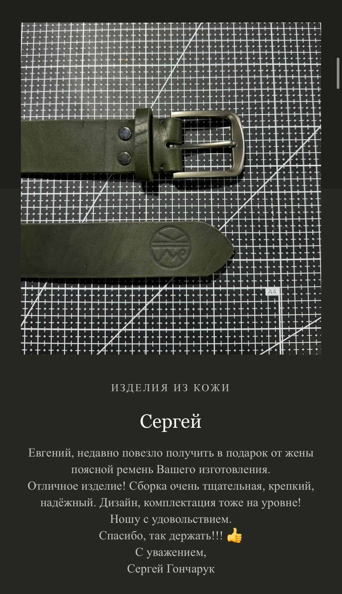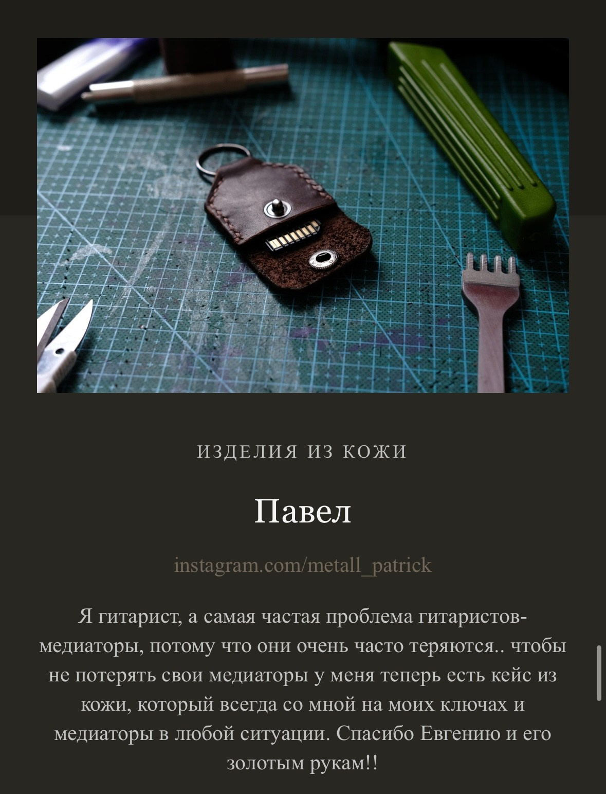 Я, Евгений Ким, создаю каждое изделие вручную. Для меня важно не только то, как вещь выглядит, но и то, какие ощущения она вызывает, как лежит в руке, как стареет и становится только лучше. Мои изделия — для тех, кто ищет не просто аксессуар, а спутника, который подчеркнёт индивидуальность и останется с вами на годы.